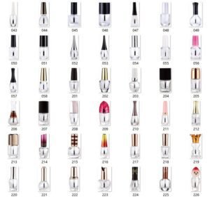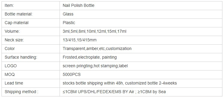 We have over 600 different shapes of nail polish bottles. The pictures shown are the popular styles. If you need other styles, please contact our sales department for discussion.Generally, they come in colors such as Amber/Clear/Blue/Green/Black. We can also customize the color according to your requirements.