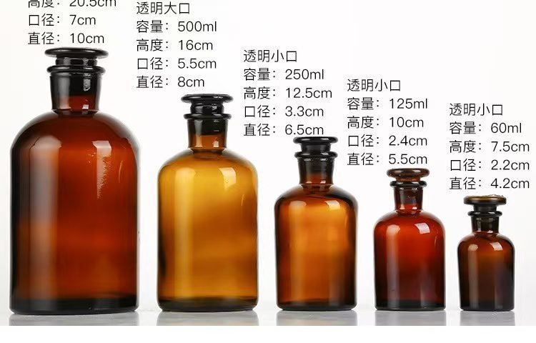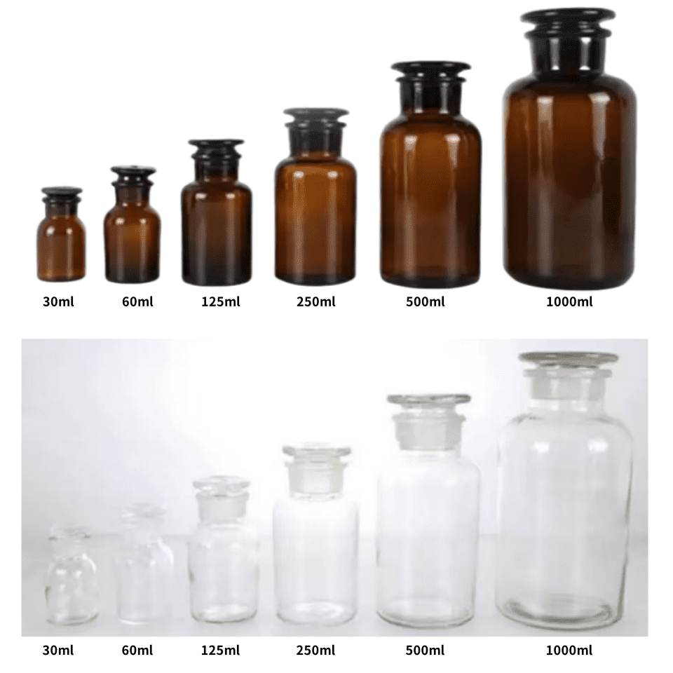 The wide-mouth reagent bottle can hold pills or liquids.Generally, they come in colors such as Amber/Clear. We can also customize the color