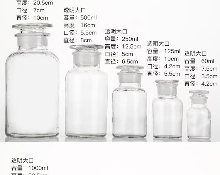 1. Glass wide-mouth reagent bottles are essential laboratory containers designed for storing and handling various chemical substances. Typically manufactured from glass  these bottles exhibit exceptional thermal shock resistance and chemical inertness, making them suitable for acids, alkalis, and organic solvents. The wide mouth design facilitates easy filling, pouring, and cleaning, while the standardized neck finish ensures compatibility with common laboratory closures like screw caps, ground glass stoppers, or PTFE-lined lids. Modern production techniques enable precise control over wall thickness and dimensional tolerances, with capacities ranging from 30ml to 1 liters. Quality control measures include rigorous testing for thermal durability (able to withstand temperature differentials exceeding 120°C) and chemical resistance (passing USP/EP hydrolytic class tests). Many bottles feature volumetric graduation marks and space-efficient square designs for improved storage. Recent advancements incorporate laser-etched permanent labeling areas and color-coding options for enhanced sample identification. Despite the growing popularity of plastic alternatives, glass remains preferred for high-purity applications due to its non-leaching properties and superior barrier characteristics against gas permeation.